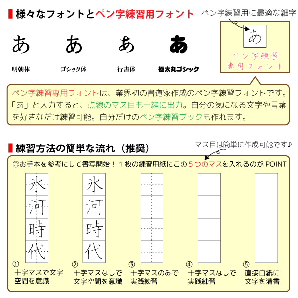 白洲ペン楷書体フォントでできること。 白洲ペン楷書体は、中本白洲先生によるペン字学習者のためのペン字練習専用フォントです。 ペン字通信講座よりも安く、ずっとお使いになれる新しい形のペン字学習フォントです。 HOME NSK白洲ペン楷書体フォントはココが違う!! ペン字練習フォントのご紹介 中本白洲直筆の楷書体フォント ペン字楷書体フォントは、メディアでも有名な中本白洲先生による直筆の書体を使用しています。 フォント作成の作業はとても根気が必要で長い年月をかけて作成いたしました。JIS第一水準、JIS第二水準の漢字をすべて網羅しております。 白洲先生ご自身が、一度書いた文字であっても、気にいらない文字についてはその都度書き直すなどの作業を繰り返しております。 このようなペン字楷書体フォントは、長い時を経て完成したとても価値あるフォントす。 白洲ペン楷書体 手本白洲ペン楷書体 十字マス目 フォント白洲ペン楷書体 外枠 フォント 白洲ペン楷書体 手本フォント白洲ペン楷書体の手本書体です。中本白洲先生直筆のフォントですので通常ご使用になるフォントとしてもお使いいただけます。よどみのない、美しい楷書体です。 白洲ペン楷書体 十字マス目付きフォント白洲ペン楷書体フォント(手本)に十字マスを備えたフォントです。ペン字学習の際に、このフォントを利用される方が多いです。 白洲ペン楷書体 外枠 フォント白洲ペン楷書体のお手本に外枠をつけたタイプの書体です。ペン字練習の際に、十字マスに慣れた後に利用すると効果的なペン字学習が可能です。 ペン字練習用フォント「白洲ペン楷書体フォント」 ペン字フォント 字の種類 価格 ①十字マス目付ペン字楷書体 8,200円 ②外枠付ペン字楷書体 6,200円 ③手本ペン字楷書体 6,000円 単体でそれぞれ買うと20,400円になりますが、セットだと割引があります。 また、当サイトからご購入いただくと、白洲ペン楷書体フォントの最新版が手に入ります。 13,000円でペン字練習フォントが購入できます。 動作環境: Windows 2000/XP/Vista/7/8/10 Mac os X10.1以降 :利用可能。 Mac os 8.1~9.x : ATM4.6以降が必要です。(下記リンクより無料ダウンロードできます。) http://www.adobe.co.jp/support/downloads/atmmac.html その他のMAC os:利用不可。 購入者特典 ご購入の場合、特典あり。 ペン字動画レッスンテキストの割引クーポン その他のペン字フォントの割引クーポンプレゼント! 書き順がついたフォントも販売中です。